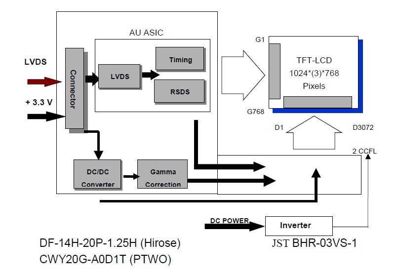 The M150XN07 V.1 is a TFT-LCD Module. It supports the XGA (1024(H) × 768(V)) screen format and 262,144 colors (RGB 6-bits data). All input signals are 1 Channel LVDS interface compatible. The M150XN07 V.1 does not contain an inverter card for backlight. It is used in desktop monitors.